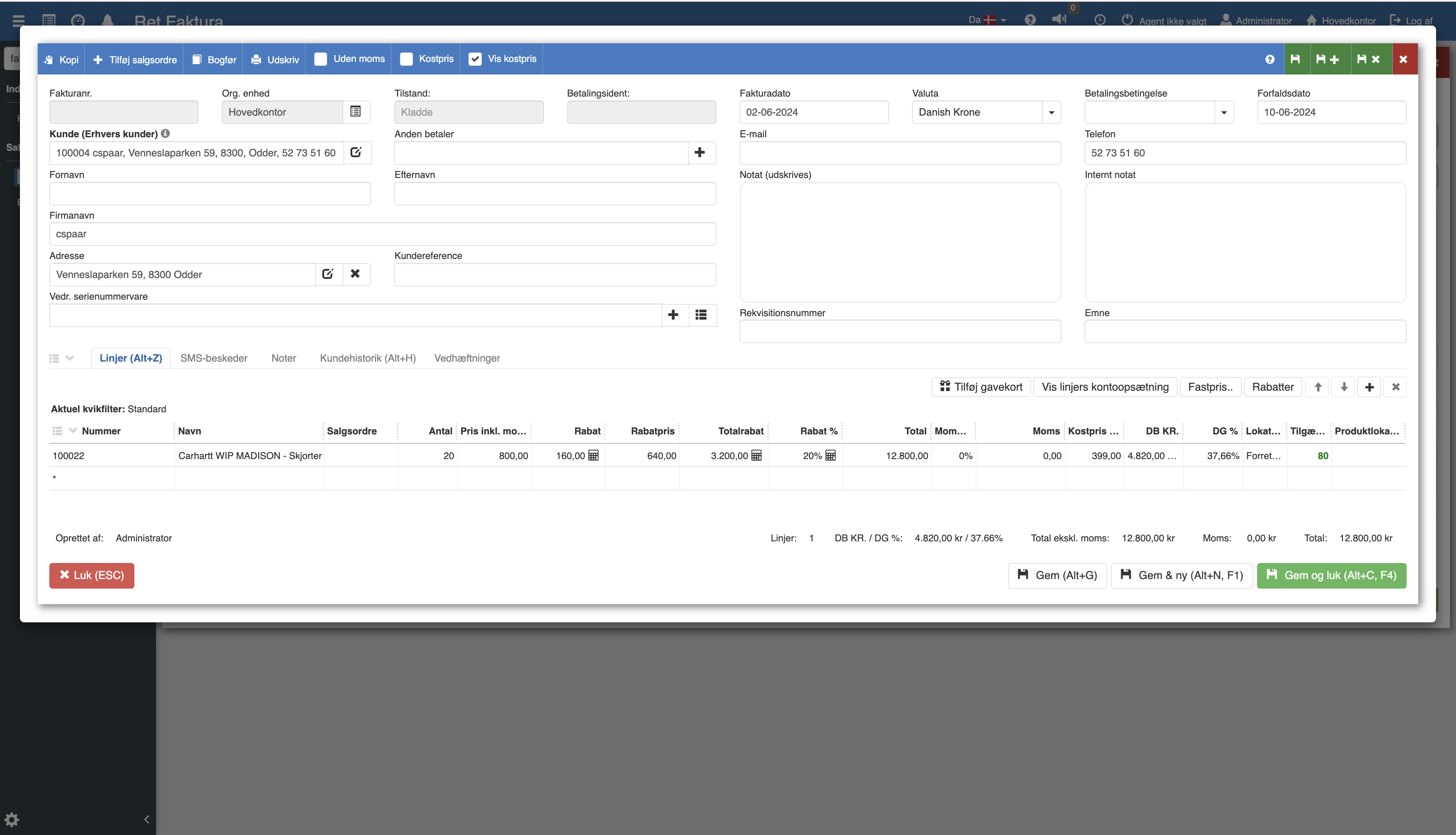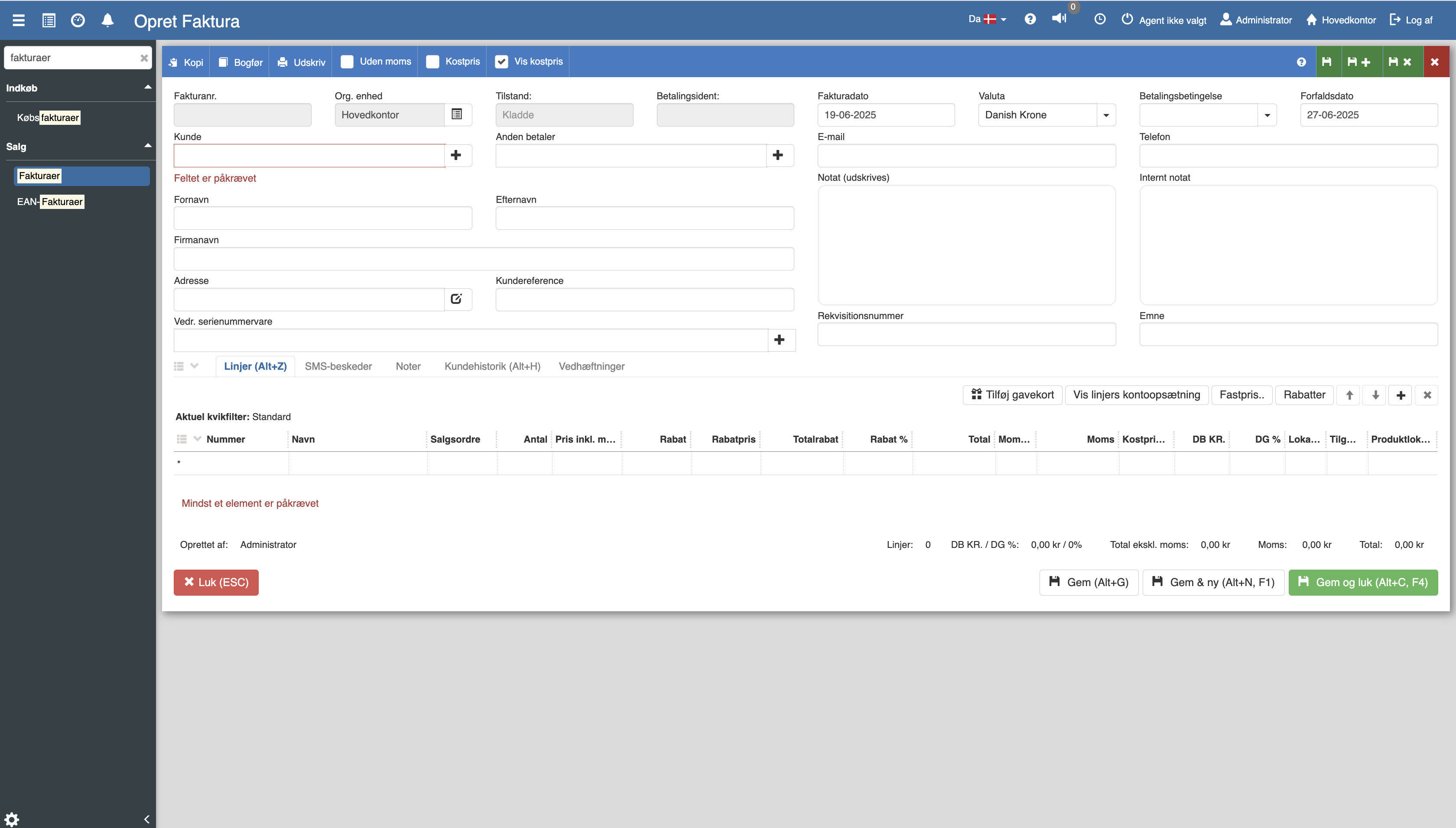 Her tilføjes fakturalinjer med detaljer som varenavn, antal, pris, rabat osv.