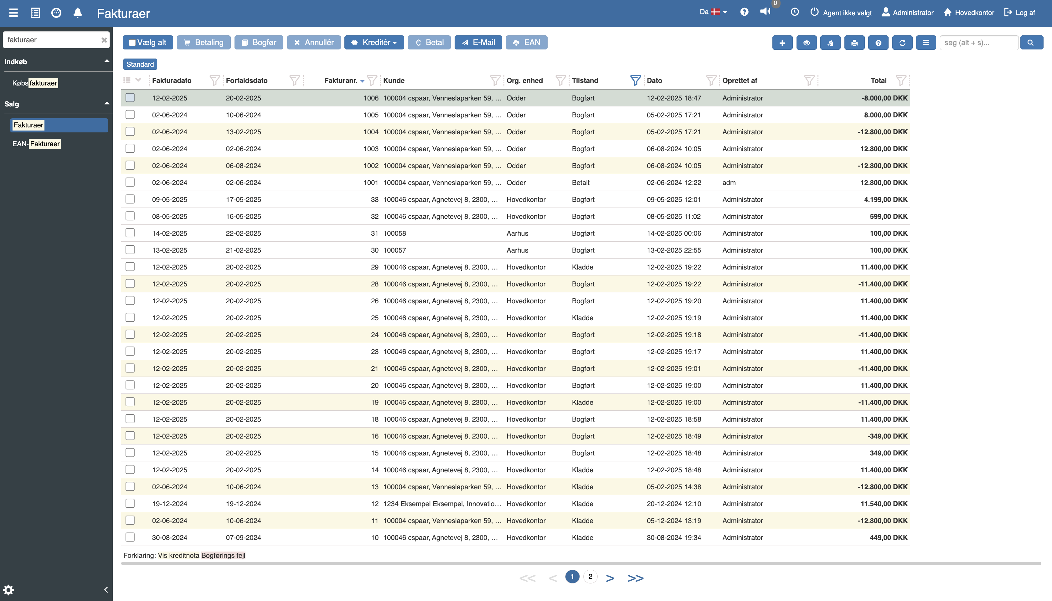 Brugerne kan nemt administrere fakturaer ved hjælp af funktioner som bogføring, betaling, kreditnota, annullering og afsendelse via e-mail eller EAN. Derudover giver oversigten mulighed for at filtrere og søge efter specifikke fakturaer baseret på nøgleoplysninger, hvilket sikrer en smidig arbejdsproces og fuld kontrol over virksomhedens fakturering.