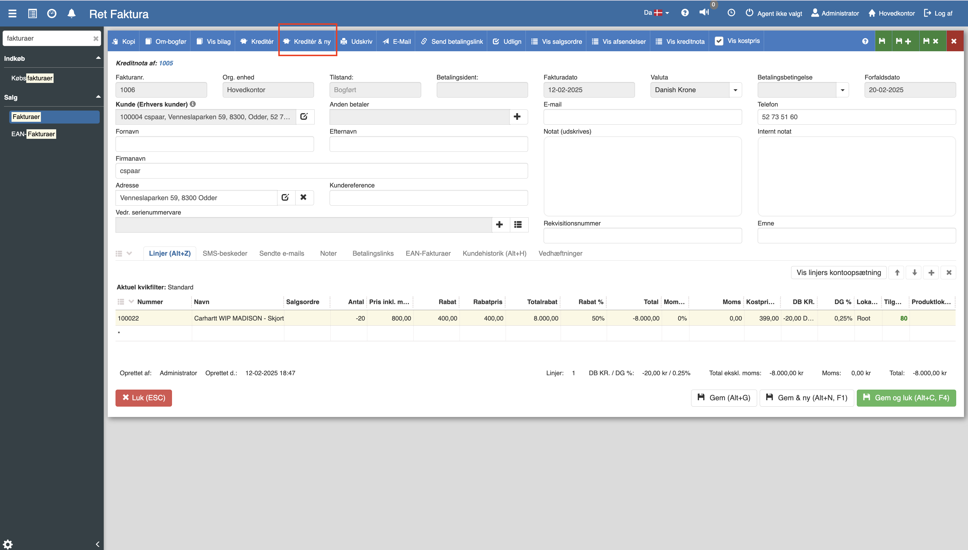 Ønsker du at oprette en kreditnota og ny faktura, hvis kunden fx er egnet til rabat, men købet allerede er foretaget, kan dette nemt gøres ved at klikke på den ønskede faktura, og herefter klikke på "Kreditér" -> "Kreditér og ny":